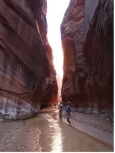 The backpack journey through this canyon covers about 40 miles before it recaches the Colorada River in Lee’s Ferry, AZ. The canyon begins shallow and wide, then narrows and deepens, with its walls rising hundreds of feet over the river. At its narrowest, the Paria River converges with Buckskin Gulch, one of the Southwest’s most famous and beautiful slot canyons. Toward the end of the trip, the canyon widens again although it remains deep.