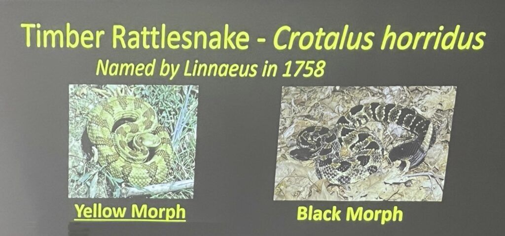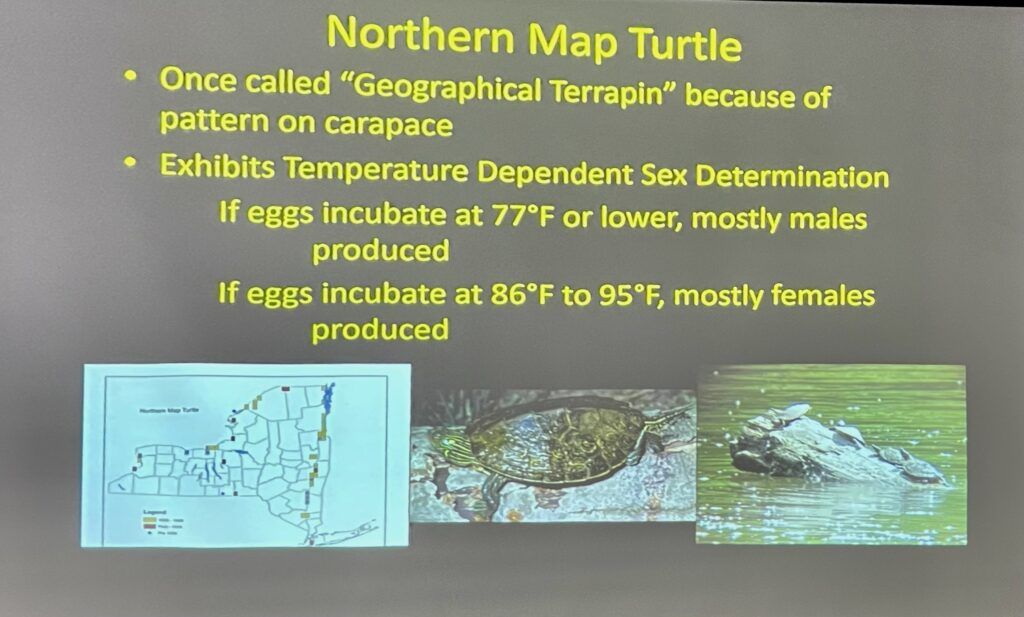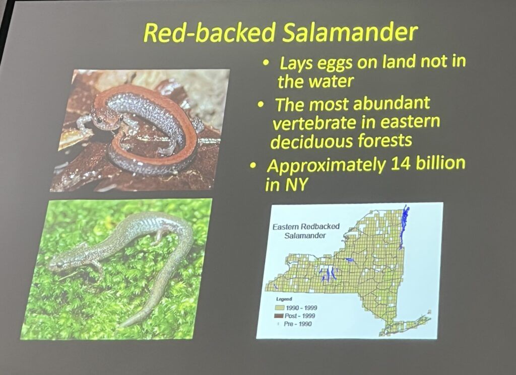 Alvin Breisch presented a fascinating talk about snakes, salamanders, turtles and lizards in NY state. Who knew that there are an estimated 14 billion redback salamanders who lay their eggs on land instead of in water, and that they are the most abundant vertebrate in the eastern deciduous forests. Or that there used to be a bounty of $2 on rattlesnakes in the north country, which led to them to become endangered, that they come in yellow and black, and their rattles get tagged with magical markers by biologists. Or that the sex of turtles is determined by the incubation temperature of their eggs. These and many more interesting facts about the herpetofauna in NY made for a highly educational evening.